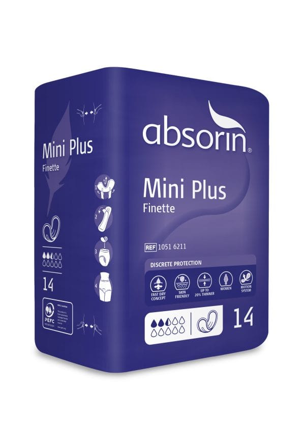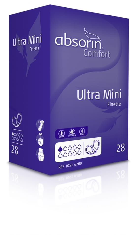 De Absorin Comfort Finette inlegverbanden zijn dunne en kleine inlegverbanden die vrijwel onzichtbaar zijn in het dragen van ondergoed en beschermd bij licht urineverlies bij vrouwen. Het inlegverband is met een brede hechtstrip te bevestigen en sluit dankzij de anatomische vorm goed aan op het vrouwelijk lichaam.